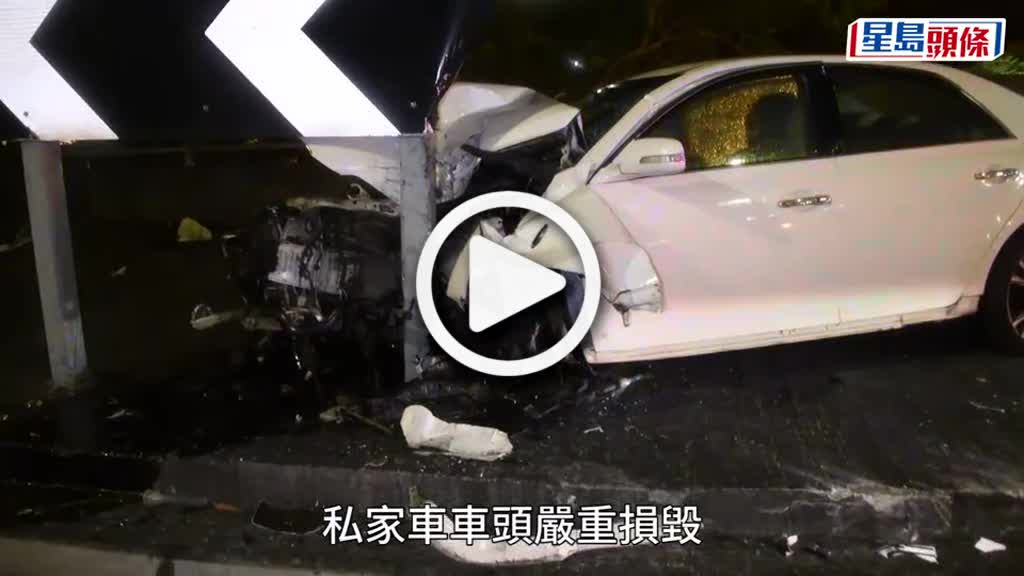 (視頻)大角咀私家車疑因天雨路滑「自炒」 鏟壆撞路牌後司機不知所終